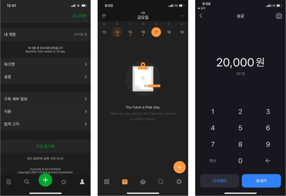 다크모드 색상 조합을 가장 잘 사용한 앱으로는 에버노트, 틱틱, 토스를 들 수 있다.