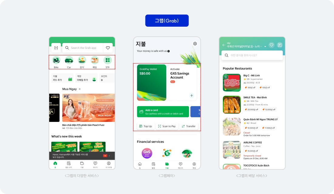 그랩은 2012년 말레이시아에서 택시 호출 앱으로 출발하여, 현재 약 2천만 명 이상의 활성 사용자를 보유하며 ‘동남아의 우버’로 불릴 만큼 대표적인 슈퍼앱으로 성장했습니다. 2014년에는 더 큰 성장을 위해 본사를 싱가포르로 이전한 이후, 현재는 택시 호출 서비스(GrabTaxi)를 넘어 차량 공유(GrabCar), 음식 배달(GrabFood), 모바일 간편 결제(GrabPay) 등 다양한 서비스로 영역을 확장하여 동남아시아 모빌리티 시장의 선두주자로 자리 잡았습니다.