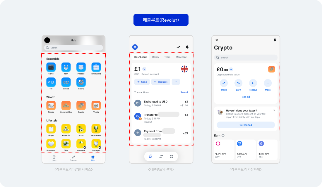 영국에서 핀테크 기업으로 시작한 레볼루트는 현재는 인터넷전문은행이 되었습니다. 레볼루트는 기존 고객의 이탈 방지와 신규 고객 확보에 힘쓰며 짧은 시간 내에 금융 슈퍼앱의 지위를 획득했습니다. 또한 위챗의 미니 프로그램과 유사한 허브(Hub)에서 내가 원하는 서비스만 모아 나만의 커스텀 메뉴를 만들 수 있습니다. 이러한 노력으로 창업 7년 만에 1800만 명의 고객을 확보하였습니다.