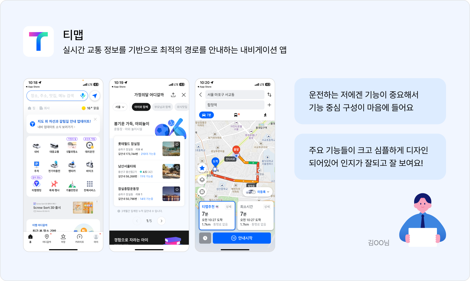 사람들이 '심미성과 사용성이 모두 뛰어나다'고 느끼는 앱은 어떤 것일지 궁금해졌습니다. 이에 가볍게 주변인들을 대상으로 인터뷰를 진행해 보았습니다. 이번 리서치는 객관적인 데이터나 충분한 표본을 기반으로 한 것이 아니라, 질문을 들었을 때 즉각적으로 머리에 떠오른 앱이 무엇인지를 확인하는 데 초점을 두었습니다.1. 티맵
