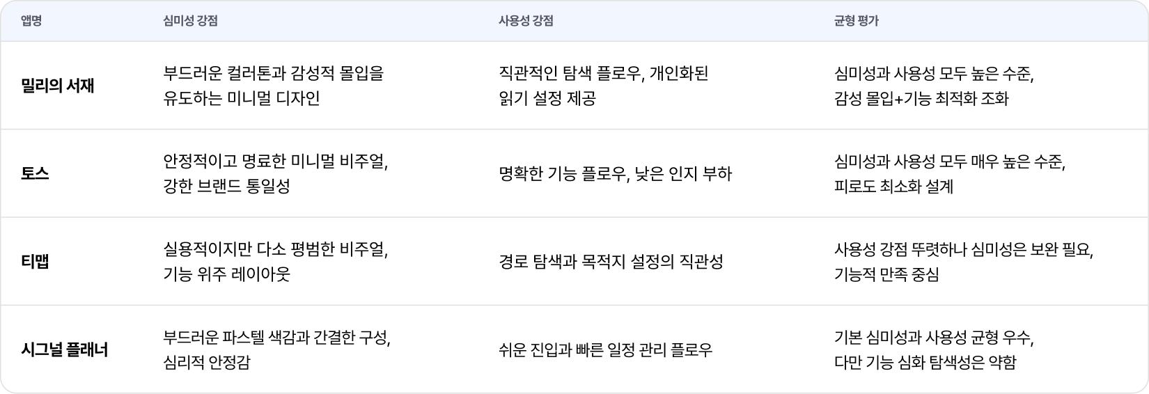 많은 사람의 의견은 아니지만 주변인들에게 자신이 생각하는 심미성과 사용성 둘 다 좋은 앱을 생각했을 때 무엇이냐고 물어봤을 때 나온 앱으로는 토스, 티맵, 밀리의 서재, 시그널 플래너가 나왔습니다. 심미성이나 사용성은 개인의 취향과 경험에 따라 달라질 수 있는 주관적인 요소입니다. 그럼에도 불구하고, 많은 사람이 심미성과 사용성 두 요소가 모두 뛰어난 제품에 대해서는 강한 인상을 받으며, 이러한 제품은 기억에 오래 남고 자연스럽게 지속적으로 사용하게 되는 경향이 있습니다. 이는 디지털 피로도 해소뿐만 아니라 장기적인 사용자 경험에도 중요한 영향을 미치는 요소로 볼 수 있습니다.