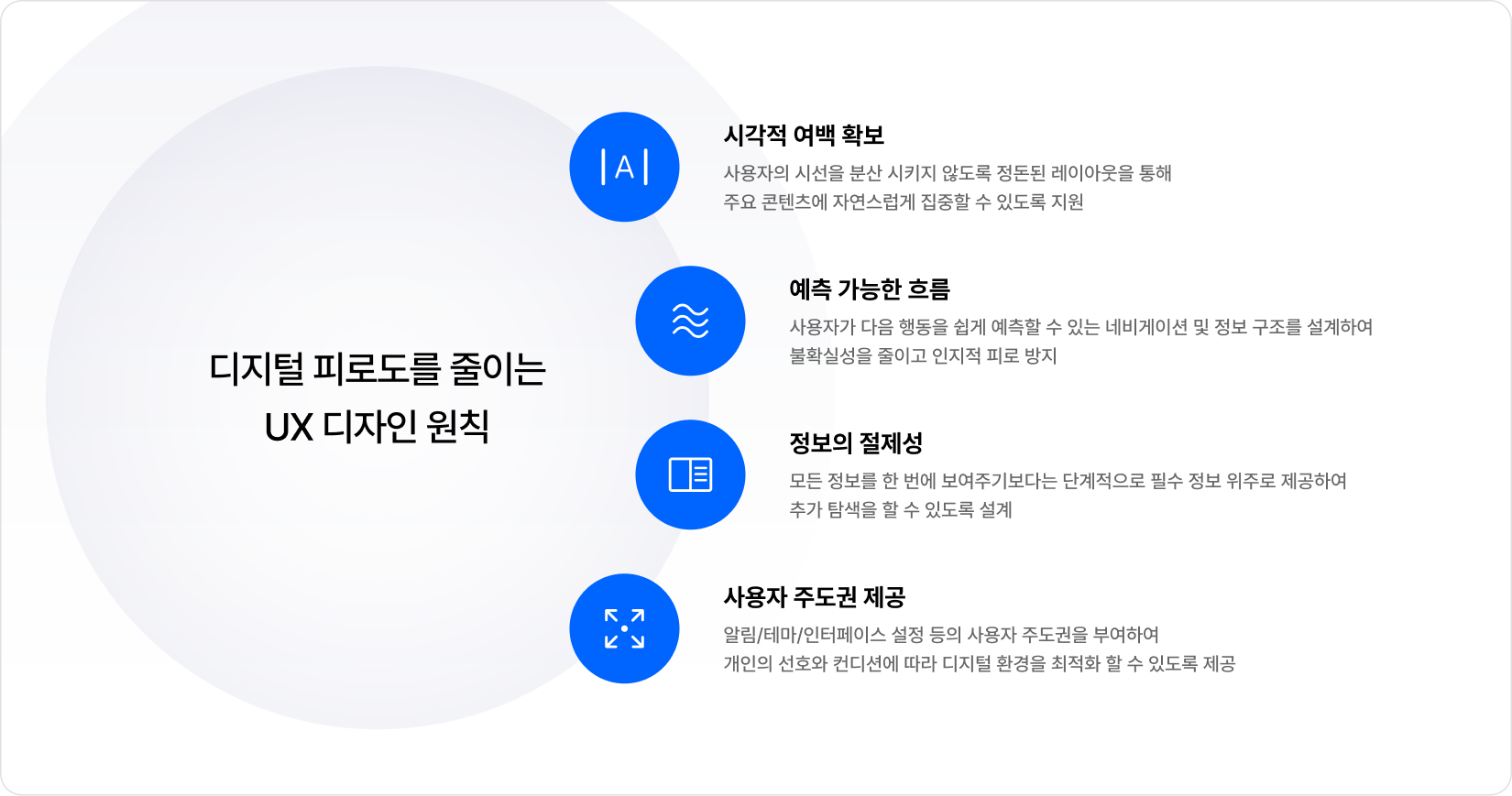앞서 말한 인지적, 시각적, 정서적 피로를 최소화하기 위해서는 단순한 기능 축소가 아닌, 심미성과 사용성의 균형이 있어야 하는데요. 지켜야 하는 최소한의 원칙적 요소가 있습니다.