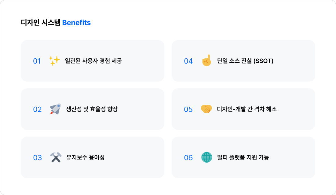 이런 문제들을 해결하고, 더 나아가 팀의 생산성과 서비스의 품질을 높이기 위해 디자인 시스템은 꼭 필요해요. 디자인 시스템이 가져다누는 대표적인 이점들을 아래에서 하나씩 살펴볼게요.