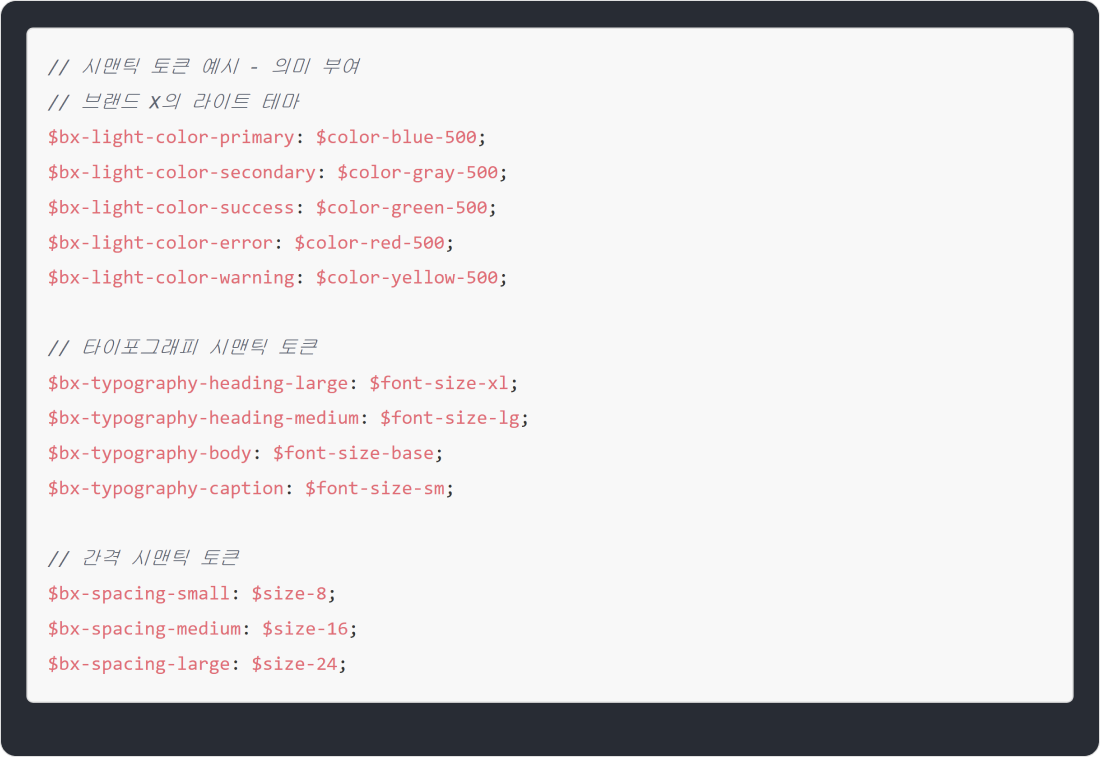 이 값을 $bx-light-color-primary처럼 "브랜드 X의 라이트 테마에서 기본 색상으로 사용되는 토큰"으로 재정의할 수 있어요.