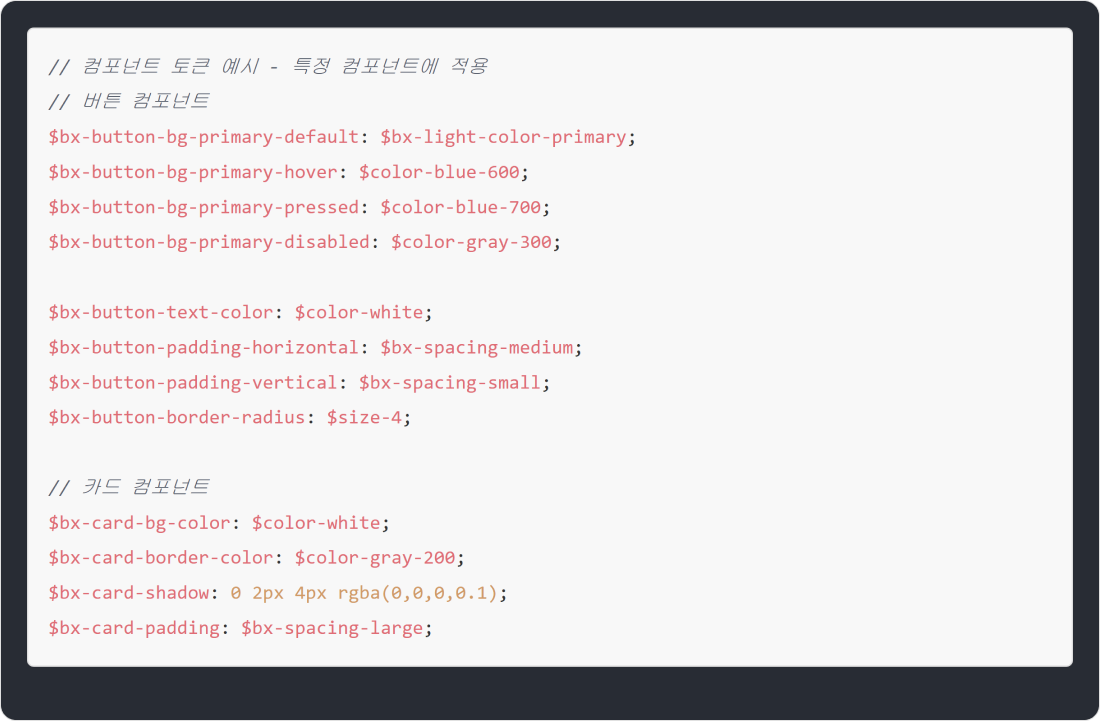 컴포넌트 토큰(Component Tokens)은 시맨틱 토큰보다 한 단계 더 구체화된 형태로, 실제 컴포넌트의 특정 속성에 시맨틱 토큰을 적용한 최종 적용 단위예요. 즉, 의미를 부여한 시맨틱 토큰을 실제 버튼, 카드, 입력창 등의 컴포넌트에 어떻게 사용할지를 명확하게 정의하는 거죠. 예를 들어 버튼의 기본 배경색을 정의할 때,$bx-light-color-primary 같은 시맨틱 토큰을 기반으로 $bx-button-bg-primary라는 컴포넌트 토큰을 만들 수 있죠.