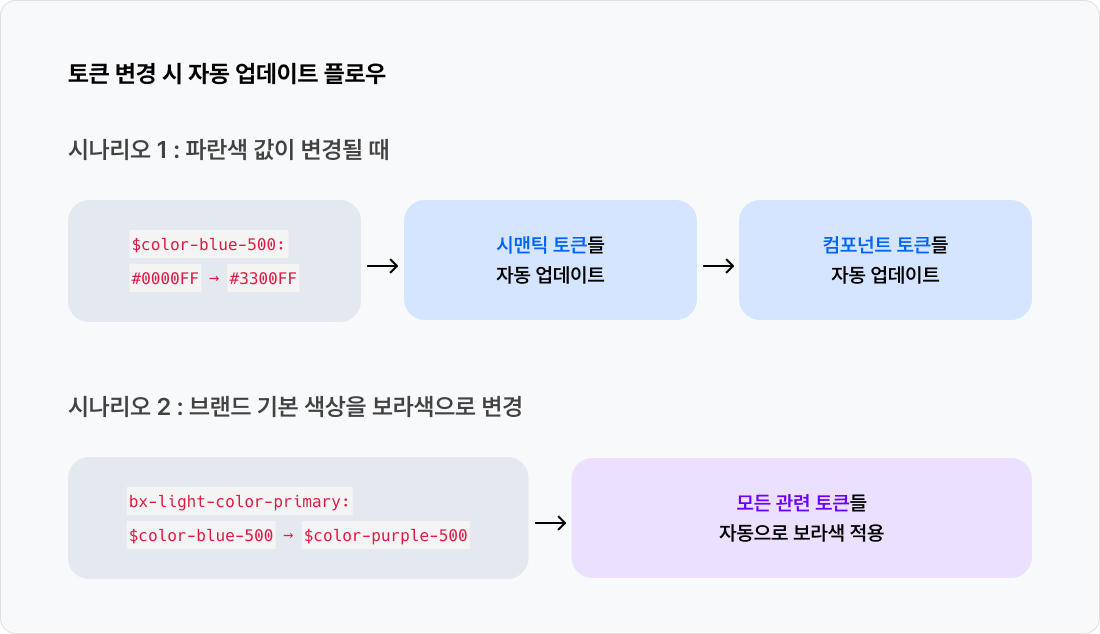 컴포넌트 토큰은 실제로 개발자가 가장 자주 마주하게 되는 영역이에요. 코드에 background-color: $bx-button-bg-primary처럼 사용하면, 해당 토큰이 어떤 색을 참조하든 자동으로 반영돼서 개발자는 별도로 수정할 필요가 없죠. 무엇보다 이 구조는 테마 변경이나 브랜드 확장에 매우 유연하게 대응할 수 있게 해줘요. 같은 컴포넌트라도 라이트/다크 테마, 혹은 멀티 브랜드 환경에서 서로 다른 스타일을 적용해야 할 때, 이 토큰만 바꿔주면 전체 UI가 일관되게 바뀌거든요. 즉, 컴포넌트 토큰은 디자이너와 개발자가 공유하는 실제 구현 단위의 디자인 언어로, 시스템 전체의 확장성과 유지보수를 책임지는 중요한 역할을 하고 있어요.