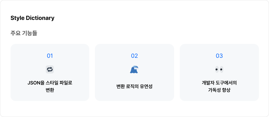 Style Dictionary는 디자인 토큰이 담긴 JSON 파일을 가져다가 개발자들이 실제로 사용할 수 있는 다양한 스타일 파일 (예: CSS 변수, SCSS 변수, Android XML, iOS Swift 등)로 변환해주는 똑똑한 라이브러리예요. 주요 기능들은 다음과 같아요.