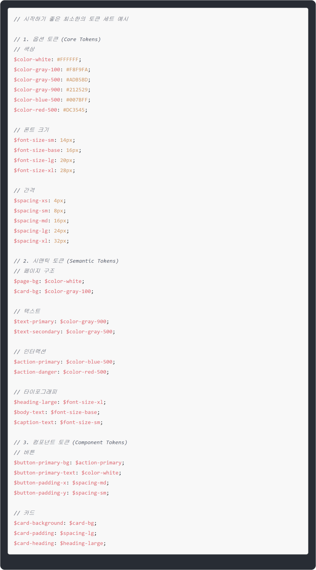 처음부터 완벽하게 모든 토큰을 정의하려고 하기보다는, 다음과 같이 적은 수의 핵심 토큰부터 시작하는 것이 좋아요.· 색상: