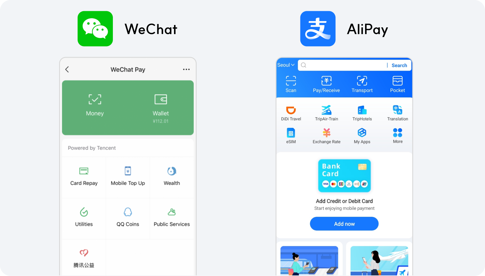 대표적인 사례가 위챗과 알리페이인데요. 위챗은 메신저에서 출발해 결제 기능까지 확대해 생활 전반에 스며들었고, 알리페이는 전자지갑에서 시작해 각종 금융과 생활 서비스를 도입하면서 슈퍼앱이 되었습니다. 중국은 친구에게 메시지를 보내다가 바로 송금을 하고, 길거리 음식점에서 QR 코드를 찍어 결제하고, 공과금과 교통비까지 처리하는 일이 한 앱에서 하는게 일상이 되었습니다. 결제와 지갑을 중심으로 배달, 로컬 커머 스, 모빌리티, 예약·여행, 공공서비스, 보험과 투자 같은 서비스가 다 연결되어있는 것 입니다.