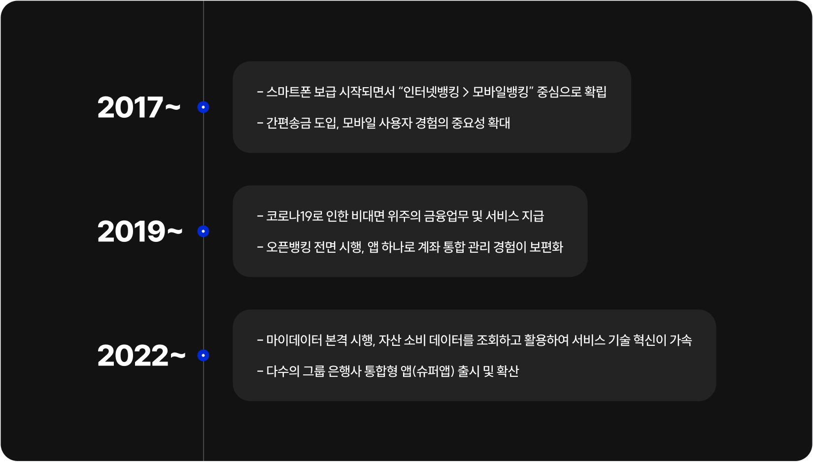 2019년도 이후에는 오픈뱅킹과 마이데이터가 도입이 되면서 여러 금융사의 계좌와 자산 정보를 한 앱에서 조회하고 이체 및 관리를 할 수 있게 되었습니다. 여기에 코로나19 이후 비대면 거래 선호도가 급격히 높아지면서 모바일 채널의 중요성은 더욱 커졌는데요. 금융위원회는 다양한 금융서비스와 생활서비스를 함께 제공하는 플랫폼 금융서비스 활성화 방안 이라는 정책을 내놓으면서 제도적으로 한 앱에서 금융과 생활을 함께 다룬다 라는 방향성의 뒷받침이 되기 시작했습니다.