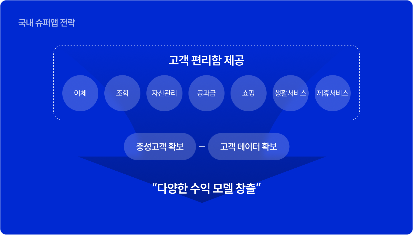 단순히 사용자만을 위한 목표로 행했을까요? 고객 입장으로 한 앱에서 통합된 서비스를 제공하면 여러 앱을 오갈 필요가 없어져, 익숙한 화면과 사용 흐름 덕분에 재방문을 이끄는 늘 켜는 앱이 됩니다. 이렇게 형성된 습관 속에서 충성 고객을 확보할 수 있을 것이라고 금융사에서는 전략적으로 다가간 것입니다.