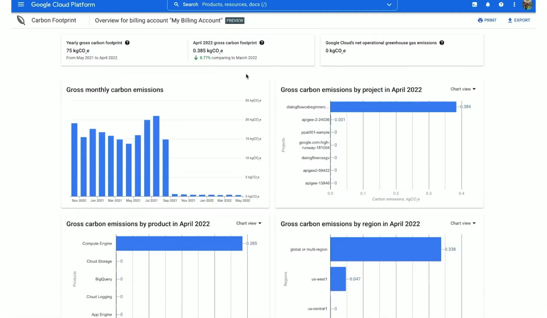 기업 사용자가 구글 서비스를 이용할 때 발생하는 탄소 배출량을 대시보드로 실시간 시각화하여 제공합니다.
