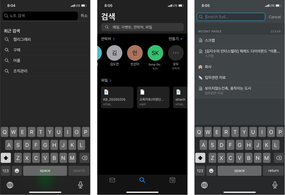 아래 세 가지 앱의 검색 영역을 살펴보자.