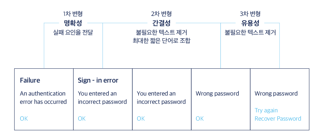 예컨대 구글에서는 작은 팝업창 문구 하나를 작성하는 데에도 위와 같이 여러 단계의 프로세스를 거친다고 한다. 명확성, 간결성, 유용성에 대한 검증을 거쳐 맨 처음의 모호했던 오류 문구에서