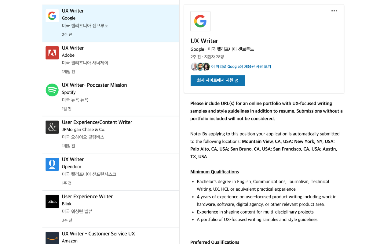 링크드인에 글로벌 기업 기준으로 UX writer라고 검색해보았더니 수많은 결과가 나왔다. 리스트 중 대부분이 세계적인 빅테크 기업들이라는 점이 새삼 놀라웠다.
