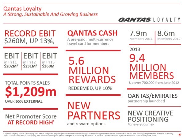 이 로열티 프로그램은 항공권 구매는 일부일 뿐 일상 속 다양한 활동으로 포인트를 쌓을 수 있다. 드라이클리닝, 커피 구매, 놀이방, 골프, 보험가입 등 비행과 상관없는 제품이나 서비스로 포인트를 쌓고 사용할 수 있게 했다. 이런 로열티 프로그램은 콴타스 국제사업 전체 수입에 가까운 매출을 기록했다. 울워스 마트, 호이츠 영화관, 록풀 레스토랑, 에어비앤비와 우버 같은 기업도 콴타스의 포인트를 구매해 고객에게 보상을 위해 사용한다. 기업들이 구매하는 포인트는 국제선 항공권을 파는 매출보다 크다.
