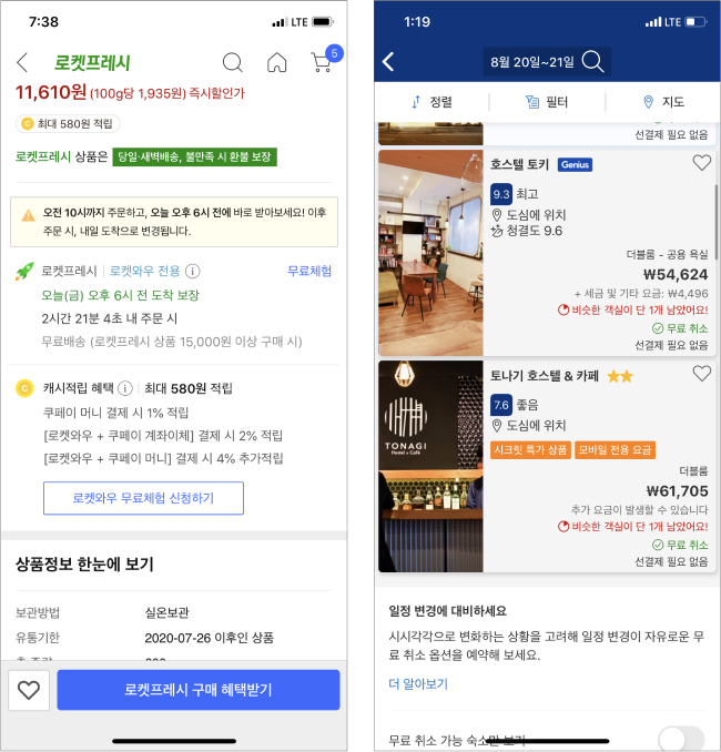 쿠팡은 고객이 체감할 수 있는 '지금'을 보여준다. X시간 XX분 XX초 내 주문 시 오후 6시 이전 도착 보장. 초마다 바뀌는 시간은 고객에게 즉각적으로 체감되는 효과를 준다. 고객들이 쿠팡을 이용하는 중요한 이유 중 하나가 로켓 배송인데 '지금 구매하면 이 물건을 빨리 받아볼 수 있다'는 심리적, 시각적 압박을 주어 구매를 유도한다.