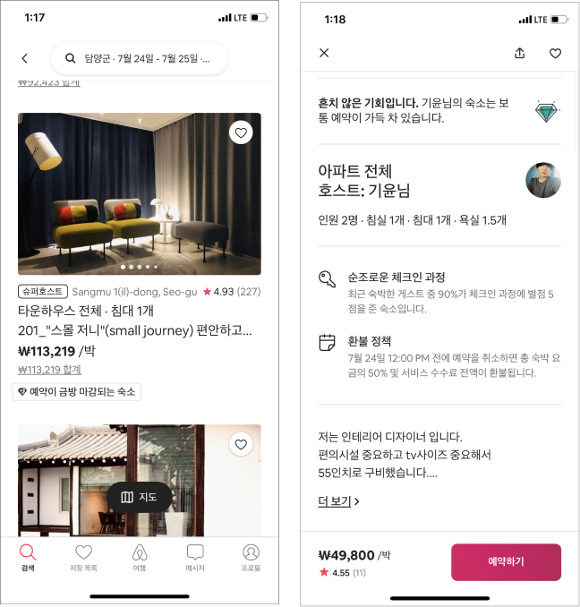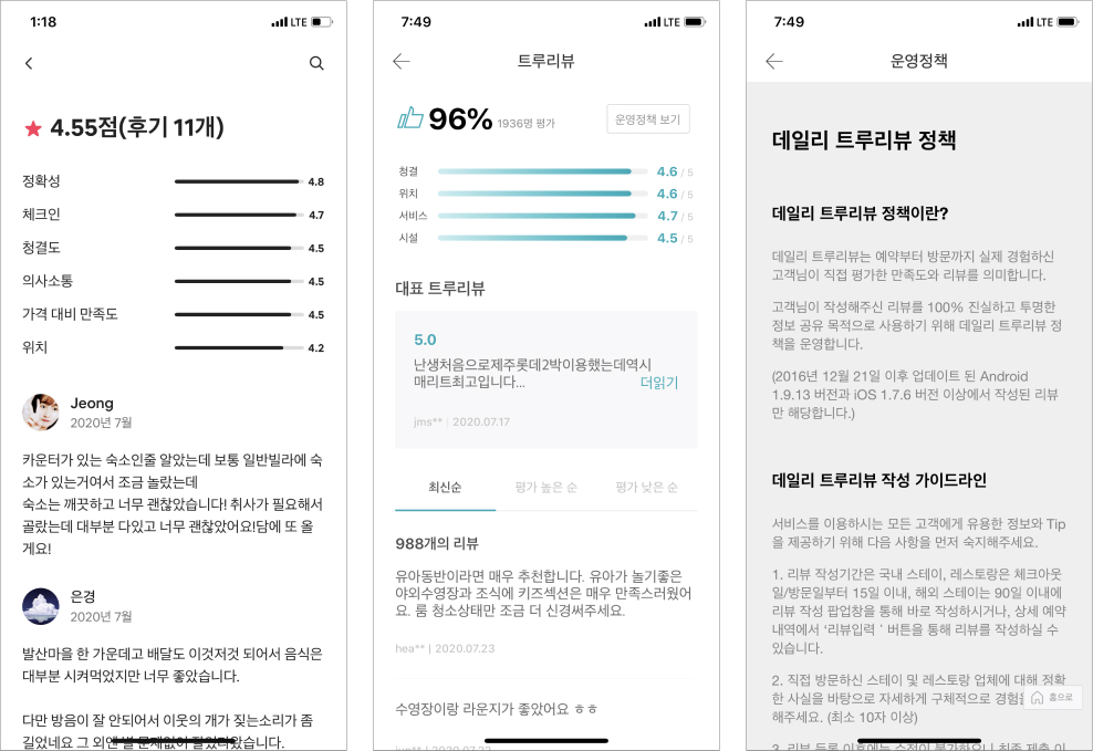 에어비앤비, 데일리 호텔 같은 숙박시설들은 고객 사용후기가 중요한 곳이다. 따라서 고객들이 숙소를 사용하며 느낄 수 있는 총체적 경험들을 '정확성, 체크인, 청결도, 가격' 등으로 체크하고 실제 사용한 고객들의 텍스트, 이미지 리뷰를 적극 활용해 또 다른 고객들을 후킹 한다.