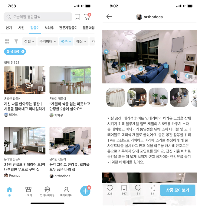 오늘의 집은 사용자들의 리뷰로 만들어가는 앱이다. 자신의 취향이 담긴 집 사진을 공유하면서 실제로 구매한 가구들이 실제 집에 배치되면 어떤 느낌이 나는지 우리 집과 비교했을 땐 어떨지 간접 체험을 해볼 수 있다. 여기서 포인트는 사용자가 올린 집 사진에 어떤 제품을 사용하고 있는지 확인할 수 있는 스크래핑 장치이다. 사진 속 제품을 오늘의 집에서 구매했다면 구매했던 링크를, 똑같은 제품이 없다면 비슷한 제품을 찾아서 올릴 수도록 링크를 연결하고 있다. 별다른 설명 없이 사진과 사진 속 +아이콘을 눌러 상품 상세로 가는 링크 성 사진만 보인다. 이처럼 정보를 단순화시키고 접근하기 쉽게 만들어 사용자들이 제품을 쉽게 탐색하고 구매할 수 있게 했다.