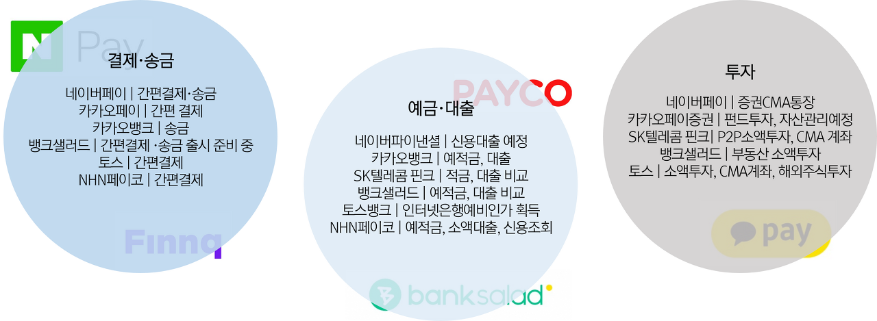 하지만 국내 플랫폼은 금융업에 직접 뛰어들기보다는 금융회사의 상품을 판매하는 채널의 역할을 하는 경우가 대부분이다. 실제로 국내 한 시중은행은 수신상품의 판매량이 내부채널과 외부 플랫폼이 비슷한 수준까지 이르렀다. 국내 대표 플랫폼인 카카오나 네이버도 간편 결제와 송금 서비스으로 시작해 예·적금, 대출, 펀드, 보험 서비스 등의 상품 판매 역할로 서비스를 확장해 나간다.