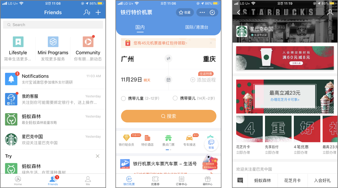 알리페이 내 미니앱은 사용자에게 필요한 알림과 도움말을 선도적으로 제시한다. 또한 개개인 마다 다른 고객의 니즈를 파악해 추천서비스와 할인쿠폰 등을 제공한다. 단순한 페이서비스가 아니라 사용자가 어떤 시간에 어떤 매장을 가는지, 선호하는 브랜드와 제품은 무엇인지 모두 알고 있다. 금융서비스는 플랫폼에서 도구로 활용 될 뿐 고객의 일상의 스토리를 읽어 낸다. 그래서 고객은 내 스토리를 잘 알고 있는 알리페이에서 타오바오의 상품구매, 송금, 음식배달, 공공요금 납부, 택배, 항공권 예매, 법칙금 납부 등 생활 속 다양한 서비스를 이용한다.