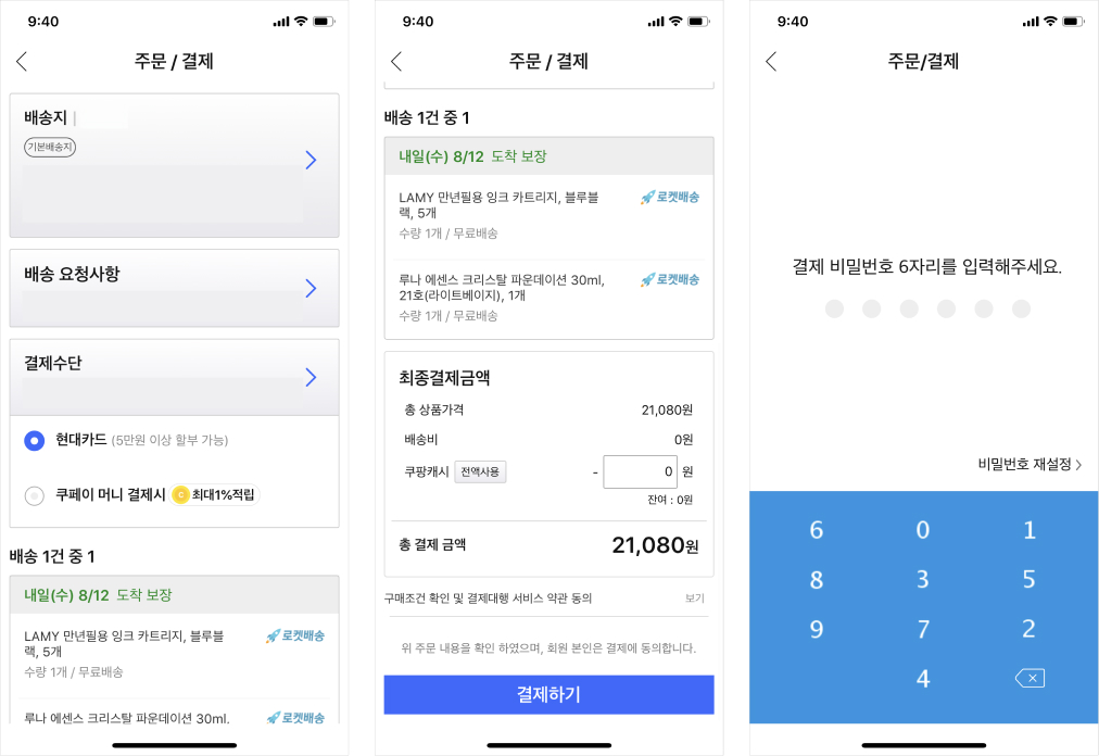 '변경' '사용' '확인' 등 몇 번의 터치를 반복하다 보면 결제 정보 입력이 끝나고 결제 시 인증은 쿠팡과 마찬가지로 등록한 결제 비밀번호로 간편하게 결제를 완료시킨다.