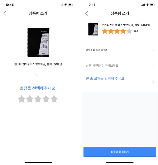 고객이 남긴 후기는 지난 글에 다룬 것처럼 다른 고객의 의사 결정에 큰 도움을 주곤 한다. 그래서 많은 플랫폼은 고객에게 상품 후기를 요청하는 경우가 많다. 그중 쿠팡의 후기는 배송이 어땠나요? 좋았나요? 별로였나요? 단 두 번의 터치만으로 심플하게 완료된다. 제품에 대한 후기 또한 사용자가 부담 없이 쓸 수 있도록 피로감이 덜 들도록 UI를 구성했다. 제품 후기를 남기는 일이 번거로운 것이 아니라 간단하게 마무리할 수 있다는 인식전환을 시키고자 하는 의도가 돋보인다.
