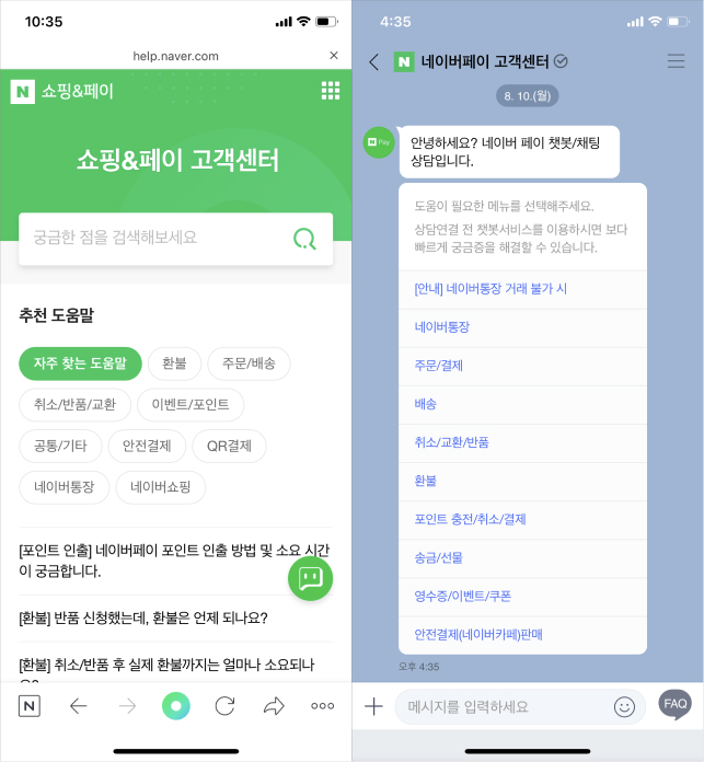 많은 플랫폼에서 고객의 문의 창구를 FAQ, 자주 하는 질문, 1:1 문의 등 의 고객이 일일이 적어야 하는 텍스트 베이스로 서비스를 제공한다. 텍스트 베이스는 끝도 없는 스크롤을 내려야 하며 직접 타이핑을 해야 하기 때문에 피로도가 쌓이기도 한다. '네이버 쇼핑'에서는 고객과 빠른 소통을 위해 챗봇을 활용한다. 터치 몇번으로 사용자의 궁금증 해결과 함께 문의, 관련 섹션을 빠르게 이동시키는 등 고객의 불편함을 해소할 수 있게 도와주고 있다. (물론 자주 하는 질문도 모아두어 제공한다.)