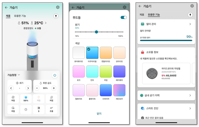 공기청정이나 가습 기능을 켜고 끄는 것, 세기나 희망 습도량을 설정하는 것 등 필수 기능은 본체에서 즉각적으로 설정하고 확인할 수 있습니다. 무드등의 컬러와 밝기를 컨트롤하는 부가 기능이나 필터 잔여량이 얼마나 남았는지 필요한 소모품은 무엇이고 어디서 살 수 있는지 등 친절한 가이드는 앱에서 만날 수 있고요, 글로 설명하자니 별 거 아닌 것 같지만 ‘본질에 집중한 본체와 정교한 서비스를 펼쳐놓은 앱’ , 이걸 직접 경험하면 그 똘똘함에 반하게 됩니다.