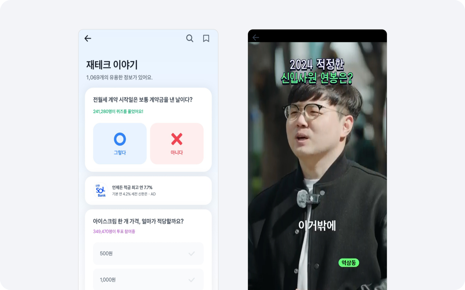 토스는 송금, 자산관리, 앱테크 요소 말고도 금융에 관련된 아티클 및 콘텐츠를 제공하고 있습니다. 그중에 ‘금융상식퀴즈’는 어렵게만 느껴지는 금융 상식을 쉽고 재미있게 습득할 수 있도록 각종 금융 퀴즈를 제시하는 콘텐츠를 진행제공하고 있습니다. ‘30초짜리 돈 이야기’는 금융에 관련된 30초 정도의 숏 영상 콘텐츠를 제공해서 꿀팁 또는 상식 정보를 지루하지 않고 빠르게 전달하고자 합니다. 이는 짧은 시간을 투자해 가볍게 볼 수 있어 사용자의 콘텐츠 이용 부담을 덜어줍니다.