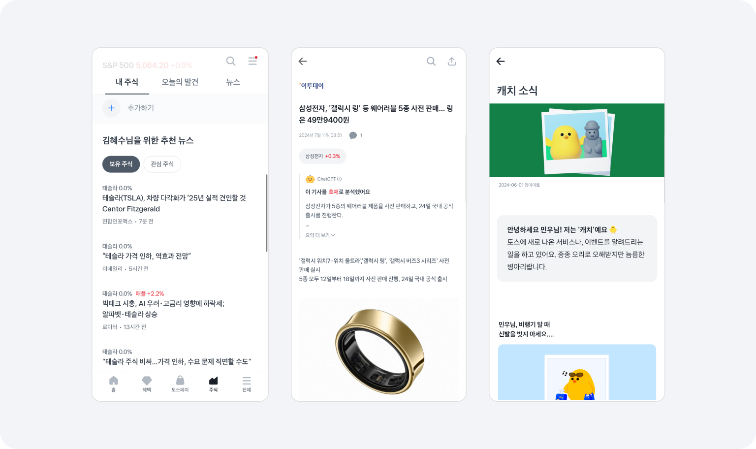 토스 캐릭터 ‘캐치’를 활용하여 만든 ‘캐치 소식’은 사용자와 소통하는 느낌으로 새로운 서비스 및 이벤트를 푸시 알림으로 제공해 주고 있어 앱 접속을 유도합니다.