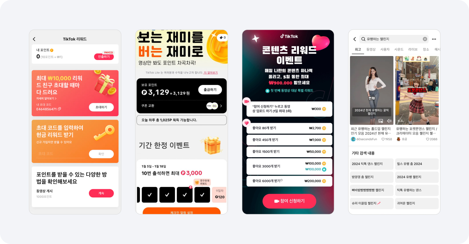 틱톡은 사용자 리텐션을 높이기 위해 어떤 노력을 했을까요? 영상 플랫폼이기에 보다 많은 사람들이 영상을 만들고 공유하는 행동이 중요한데요. 이를 유도하고 참여하게끔 하는 리워드 전략을 썼습니다. 영상을 만들어 올린 창작자에게 시청, 좋아요 수에 따른 콘텐츠 리워드를 제공하고, 광고 시청을 하는 등 사용자의 참여를 유도하고 이끄는 참여형 이벤트를 진행함으로써 코어타겟인 1020 사용자 뿐만 아니라 앱테크에 관심이 많은 3040 사용자까지 수용하여 다양한 사용자를 보유하고 있는 틱톡 플랫폼이 되었습니다.