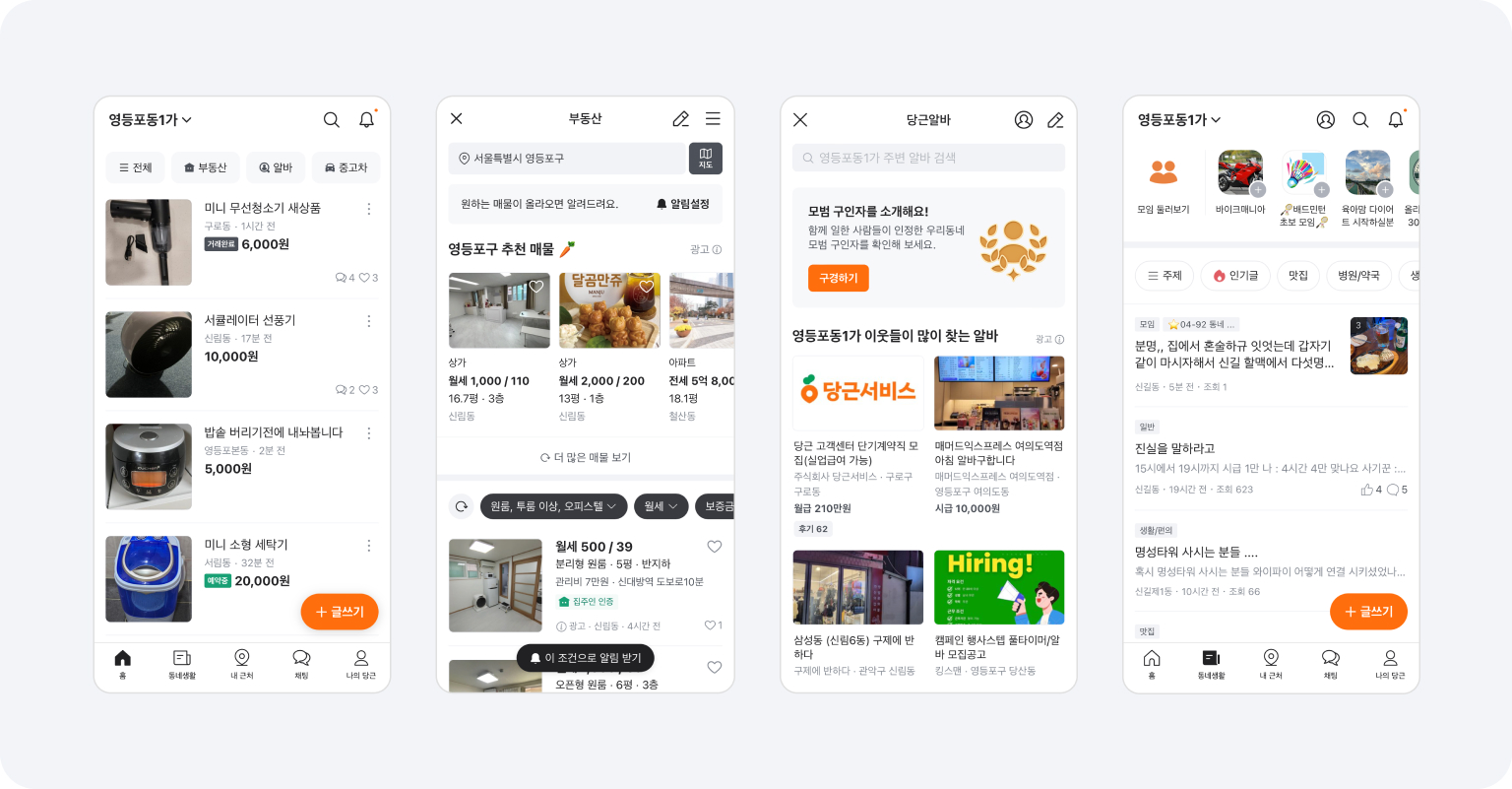 마지막은 지역 기반 커뮤니티 서비스인 당근입니다. 동네 중고거래 서비스로 시작했지만 로컬 분야에서 연결할 수 있는 모든 것을 연결하여 동네가게, 부동산, 동네알바 등 동네에서 일어나는 소식들을 빠르게 보고, 공유할 수 있는 플랫폼이 되었습니다.