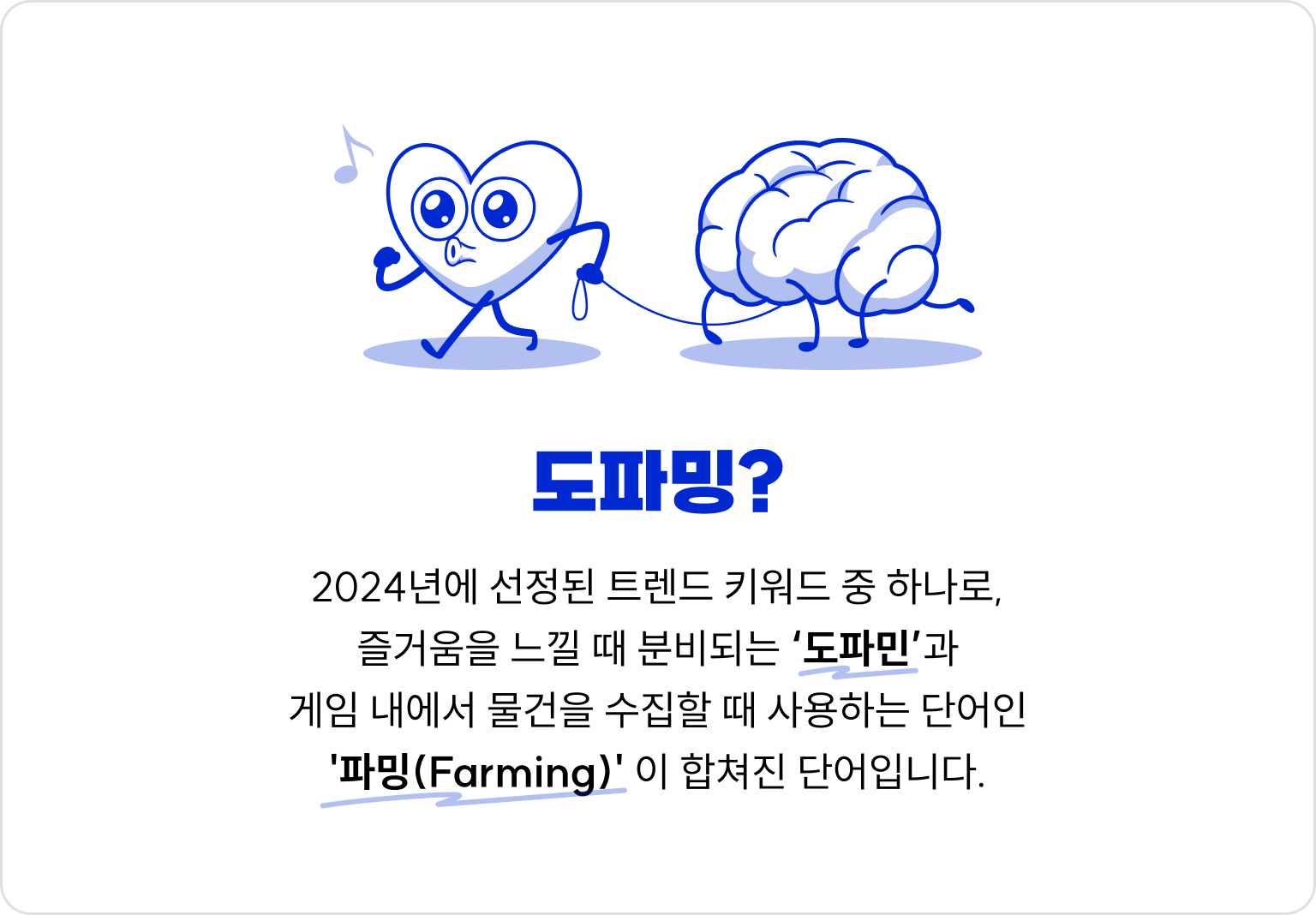 이번 ‘트렌드 코리아 2024’에서 선정한 트렌드 키워드 중 ‘도파밍’이있습니다. 도파민(Dopamine)과 파밍(Farming)의 결합어로, 신나는 경험을 통해 도파민이 분비되는 행위를 의미합니다. 게임에서 아이템을 모으는 것과 유사한 개념으로 다양한 활동을 통해 뇌가 도파민을 경험적으로 얻는 사회적 현상을 말하는데요. 도파민은 주로 새로운 것을 탐색하거나 성취하는 과정에서 ‘기쁨’의 감각과 감정을 지배하는 신경전달물질이 분비된다고 합니다. 이처럼 사용자는 새로운 것과 성취하는 것에 큰 만족감을 느낀다는 것! 앞으로 사용자 리텐션을 높이기 위해선 흥미로운 콘텐츠 및 서비스 제공으로 사용자의 행동을 유도하고 성취감을 줌으로써 보상심리를 자극하는 것 등이 중요하지 않을까 싶습니다.