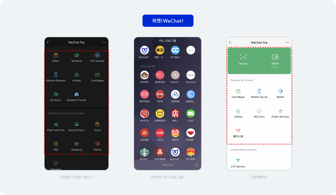전 세계적으로 슈퍼앱이 가장 발달해 있는 기업은 위챗입니다. 중국의 대표 슈퍼앱인 위챗은 텐센트(Tencent)가 2011년 소셜미디어 플랫폼으로 개발했으며 현재 월간 10억 명 이상의 활성 사용자를 보유하고 있습니다. 또한 2017년 ‘미니 프로그램’이라는 기능을 발표하여 제3자가 위챗 내에서 미니 앱을 개발할 수 있게 하며, 메신저 앱 안에서 게임, 엔터테인먼트, 쇼핑 등 다양한 서비스를 제공할 수 있게 했습니다.
