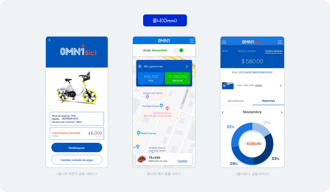 옴니는 중앙아메리카에서 가장 빠르게 성장하고 있는 슈퍼앱 중 하나로, 2019년에 자전거 공유 플랫폼으로 시작하여 택시 호출, 차량 공유 등 다양한 서비스를 제공하고 있습니다. 또한 2020년 6월, 핀테크 기능이 추가된 ‘OmniMoni’라는 서비스를 출시하여 인터넷 전문은행으로의 발전을 도모하고 있습니다. 그 결과, 옴니는 출시 1년 만에 코스타리카 Google Play 스토어에서 가장 많이 다운로드 된 앱을 기록하며 50만 건 이상의 다운로드를 기록하였습니다.