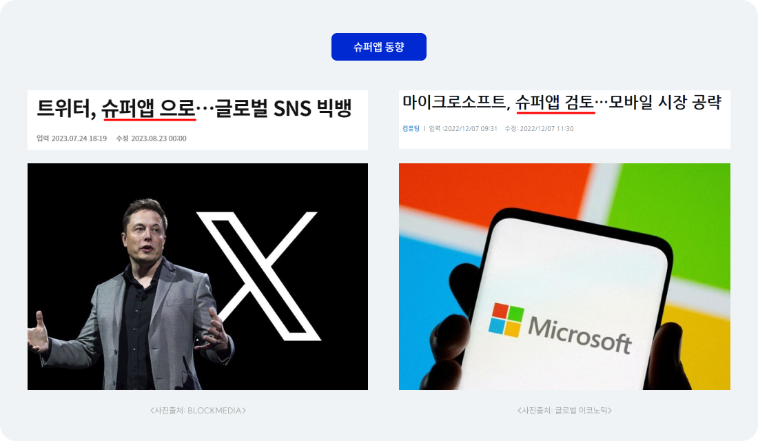 물론 이외에도 슈퍼앱으로 전환할 예정이거나 슈퍼앱을 검토 중인 기업들이 존재합니다.2022년 10월, 미국의 일론 머스크가 트위터를 인수한 후 ‘X’로 리브랜딩 하면서 X를 통해 모든 것이 가능하게 만들 것이라고 밝혔습니다. 아직 슈퍼앱과 관련된 세부사항은 공개되지 않았지만, 중국의 위챗에서 영감을 받은 것으로 알려졌습니다. 또한 마이크로소프트 역시 모바일 시장 공략을 위해 슈퍼앱을 검토 중인 것으로 언론들은 예측하고 있습니다.