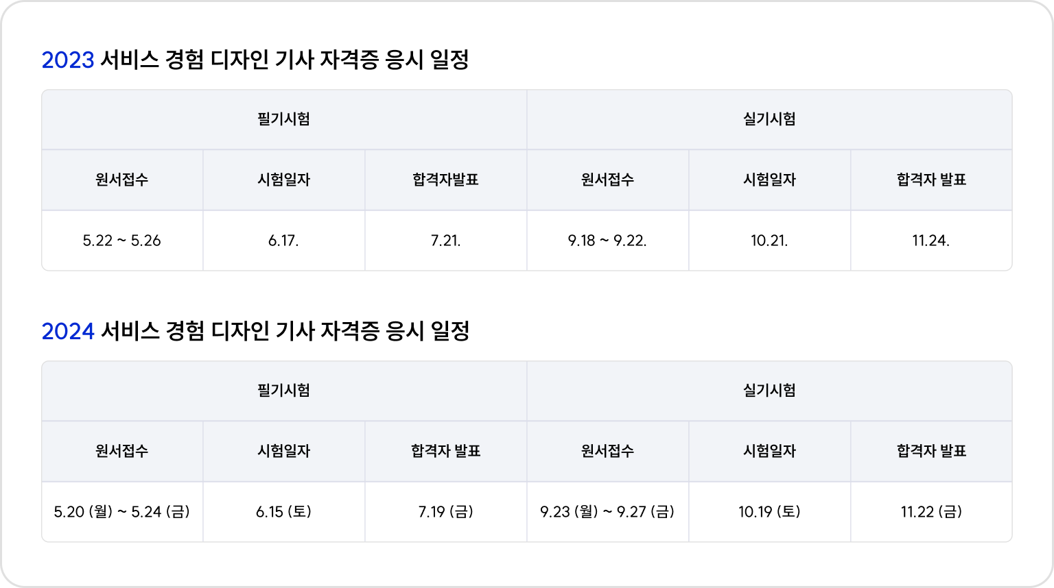 2023년에 시행한 제 4회 서비스·경험디자인기사 자격 시험의 일정과 이번 년도에 시행한 제 5회 시험 일정을 비교해보면 내년 자격 시험의 일정을 예상 할 수 있습니다.