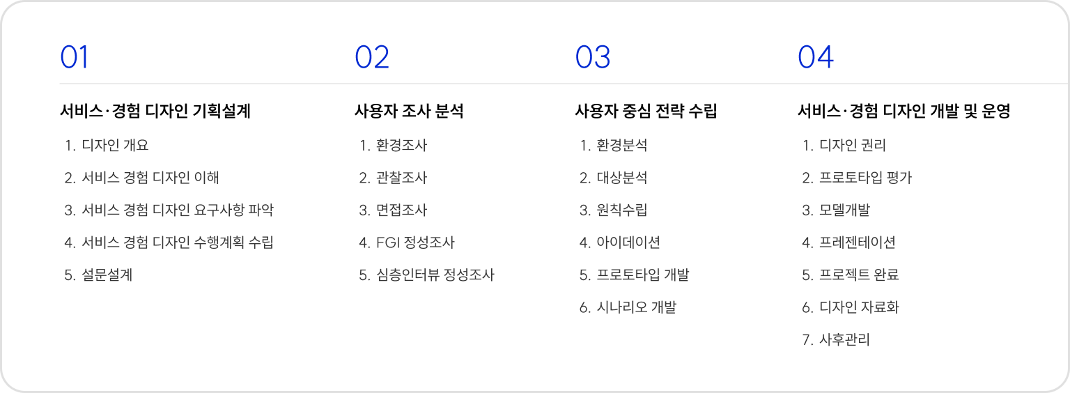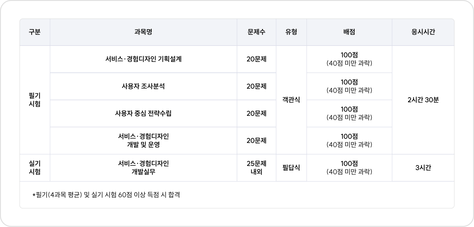자세한 과목에 대한 설명은 ‘한국디자인진흥원’에서 제공하는 ‘서비스·경험디자인기사 출제 기준안’과 ‘서비스·경험디자인 이론서’를 참고하시면 되겠습니다.