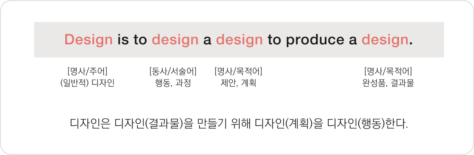 의미가 바로 전달되는 ‘사랑’과 같은 단어와 달리 ‘디자인’은 사용할 때마다 맥락적으로 대상이 달라지고, 상황별로 의미가 달라 혼란의 근원이 된다고 하였다.