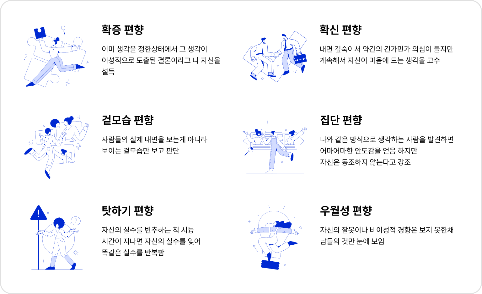 또 하나 기억에 남은 내용은 디자인 행동경제학 중 ‘비이성적 편향’에 대한 이론이였습니다. 계획을 세우거나 의사 결정을 내릴 때 나오는 다양한 편향에 대해 다루는 내용이었는데, 꼭 업무가 아니여도 주변에서 흔히 볼 수 있는 행동심리라 흥미롭게 읽었는데요! 이런 편향들을 고려하여 인터뷰나 사용자 테스트 계획을 수립해야하고, 내 자신에게 있는 편향을 자각하여 거품이 있는 경험 디자인을 해선 안되겠다고 생각이 들더라구요. 응답에 대해 분석할 때, 편향이 있을 지 파악하고 세밀하게 해야된다는 걸 알게되었습니다. 이 때문에 사용자 행동 심리에 대해 더 깊게 관심이 생겼습니다. 관련 책을 찾아 읽고 싶다는 생각이..ㅎㅎ 알아봐야겠어요!