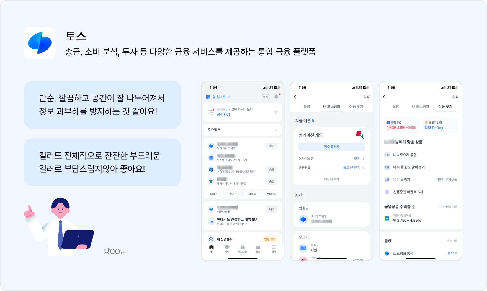 “토스가 좋다고 생각해요! 단순, 깔끔하고 공간이 잘 나누어져있어 정보 과부하를 방지하는 것 같아요!”