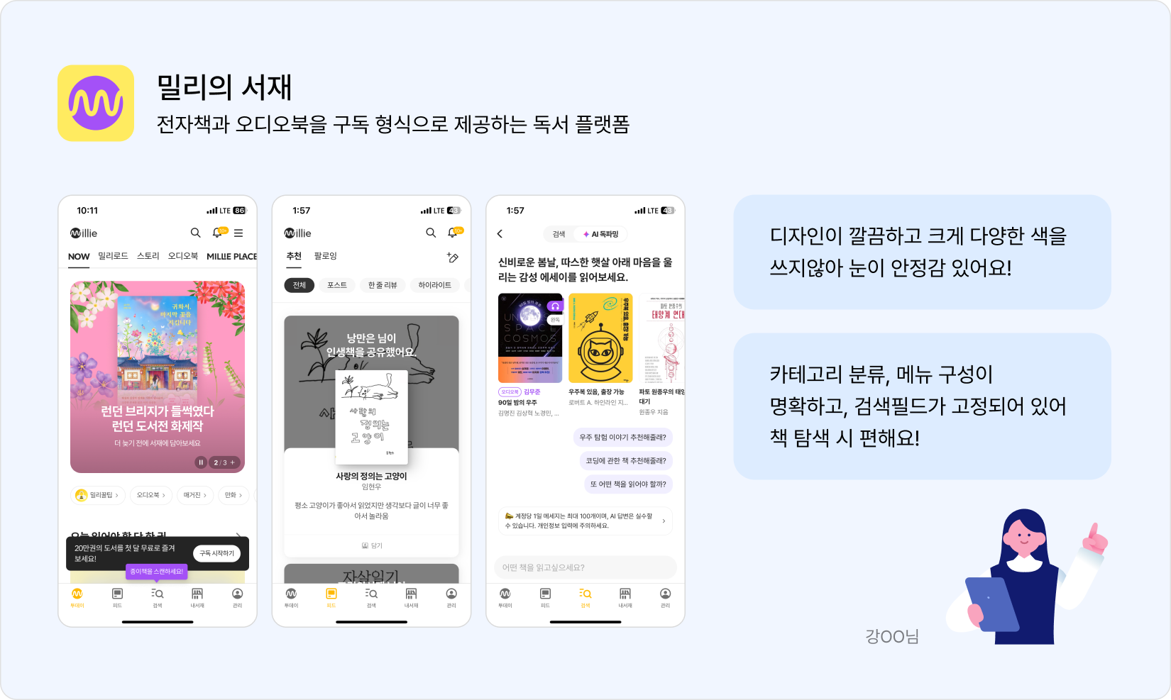 “카테고리 분류나 메뉴 구성이 명확하고, 검색창이 고정되어 있어 책 탐색 시 편해요!”