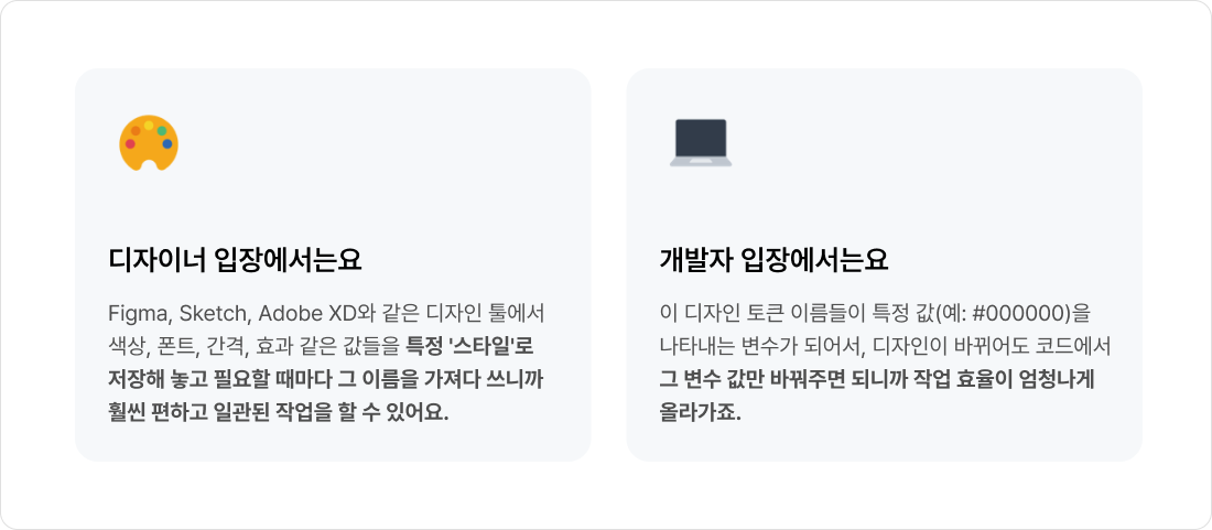 (--버튼-컬러토큰)처럼 토큰 이름으로 보이게 만들 수도 있어서, 개발자들도 어떤 디자인 토큰이 적용되었는지 쉽게 확인할 수 있죠.