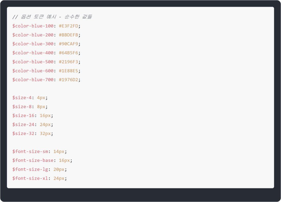 옵션 토큰(Option Tokens), 혹은 코어 토큰(Core Tokens)은 디자인 토큰 시스템에서 가장 기본이 되는 토큰이에요. 여기에는 특정한 ‘의미’나 ‘기능’, ‘디자인 결정’이 담겨 있지 않아요. 마치 요리를 할 때의 ‘기본 재료’ 같은 거라고 생각하면 돼요. 색상이나 크기, 폰트 값 같은 순수한 속성 값만을 담고 있죠. 예를 들어$color-blue-500은 단순히 파란색 계열의 500번 톤 값을,