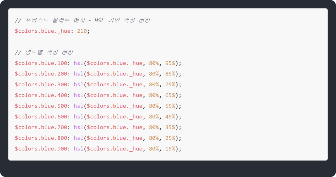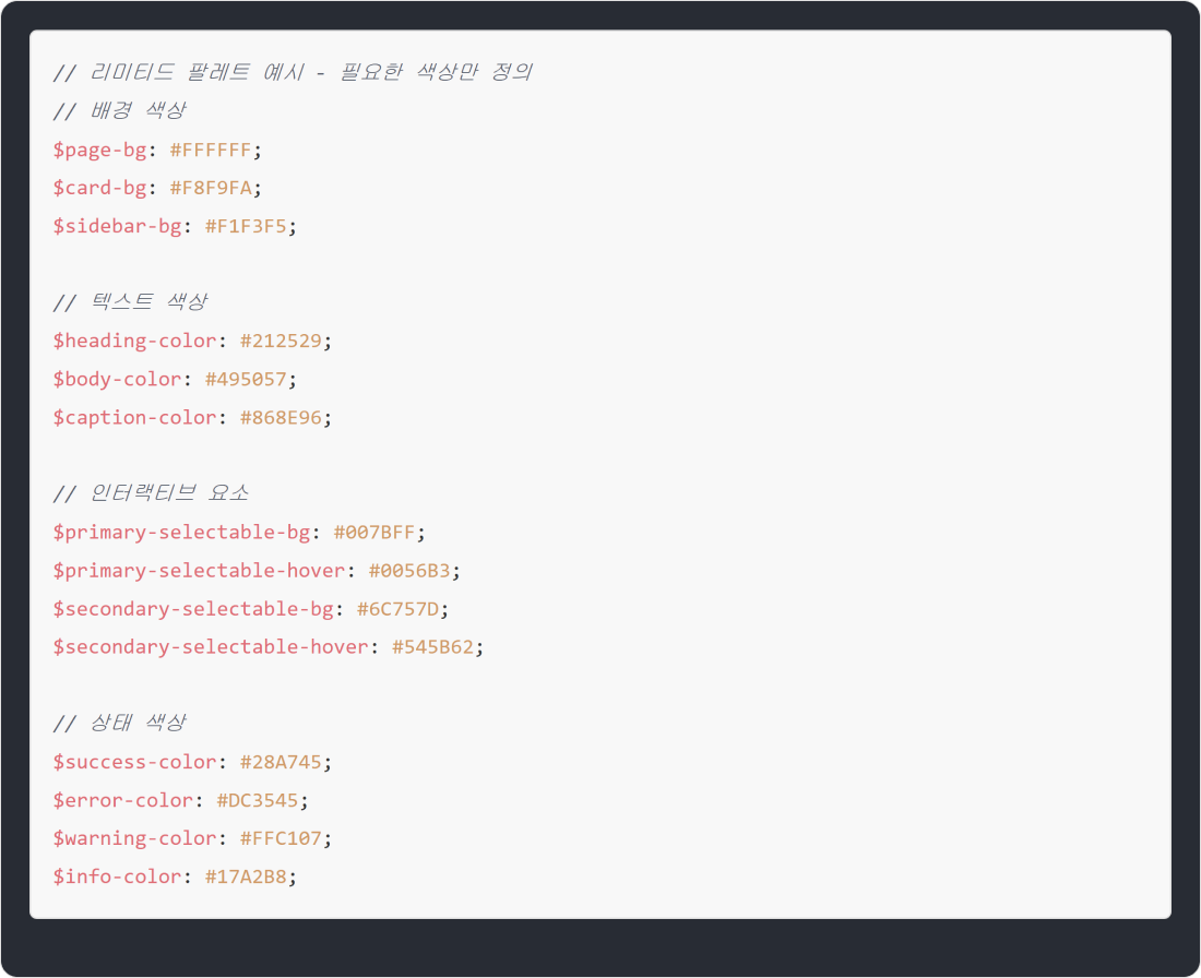 가장 좋은 전략일 수 있다고 추천하는 방식이에요. 실제로 필요한 색상만 아주 제한적으로 정의하는 팔레트죠. 단점은 모든 것을 미리 충분히 고민해야 한다는 점이에요. 모든 사용 사례와 조합, 그리고 접근성까지 고려해야 하죠. 시작점으로는