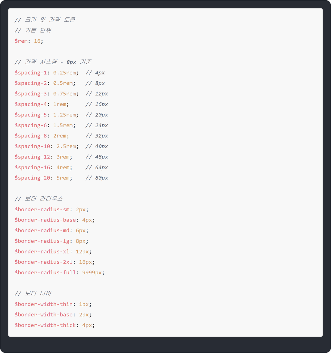 $size-8은 8픽셀이라는 크기 자체만을 나타내요. 이렇게 정의된 값들은 이후에 버튼, 로고, 체크박스 같은 다양한 컴포넌트를 만들 때