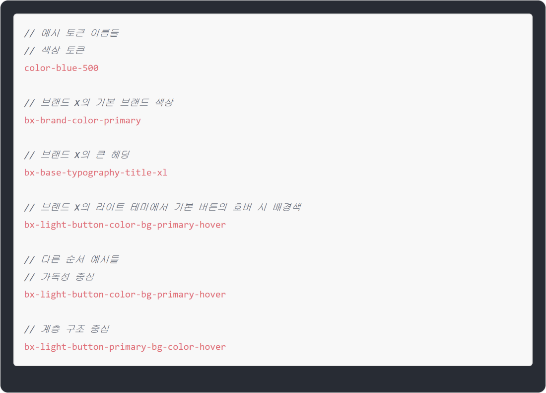 표기법의 다양성을 줄여줄 수 있기 때문이죠. 옵션, 시맨틱, 컴포넌트 토큰에 따라 적합한 순서가 다를 수 있으니,