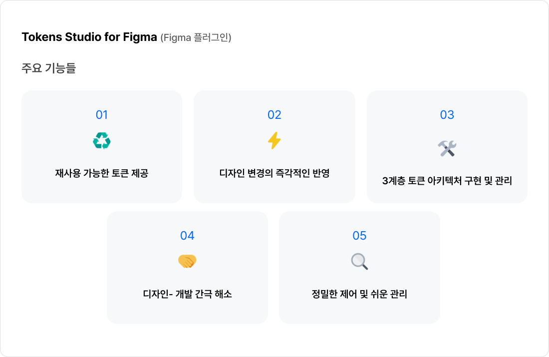 · 3계층 토큰 아키텍처 구현 및 관리: 위에서 설명한 3계층 토큰 아키텍처(옵션, 시맨틱, 컴포넌트)를 효과적으로 구현하고 관리하는 데 정말 탁월한 도구예요.
