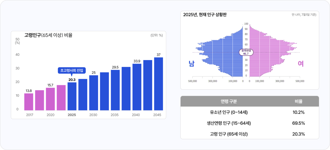 현재 한국 사회는 빠른 속도로 고령화가 진행되고 있습니다. 통계청에 따르면 현재 2025년에 전체 인구의 20% 이상이 65세 이상으로 초고령 사회에 진입하게 됐습니다. 이 수치는 단순히 ‘노인 인구가 늘어난다’라는 의미를 넘어 앞으로 디지털 서비스의 주요 사용자군에서 시니어의 비중이 급격히 커진다는 뜻이기도 합니다.